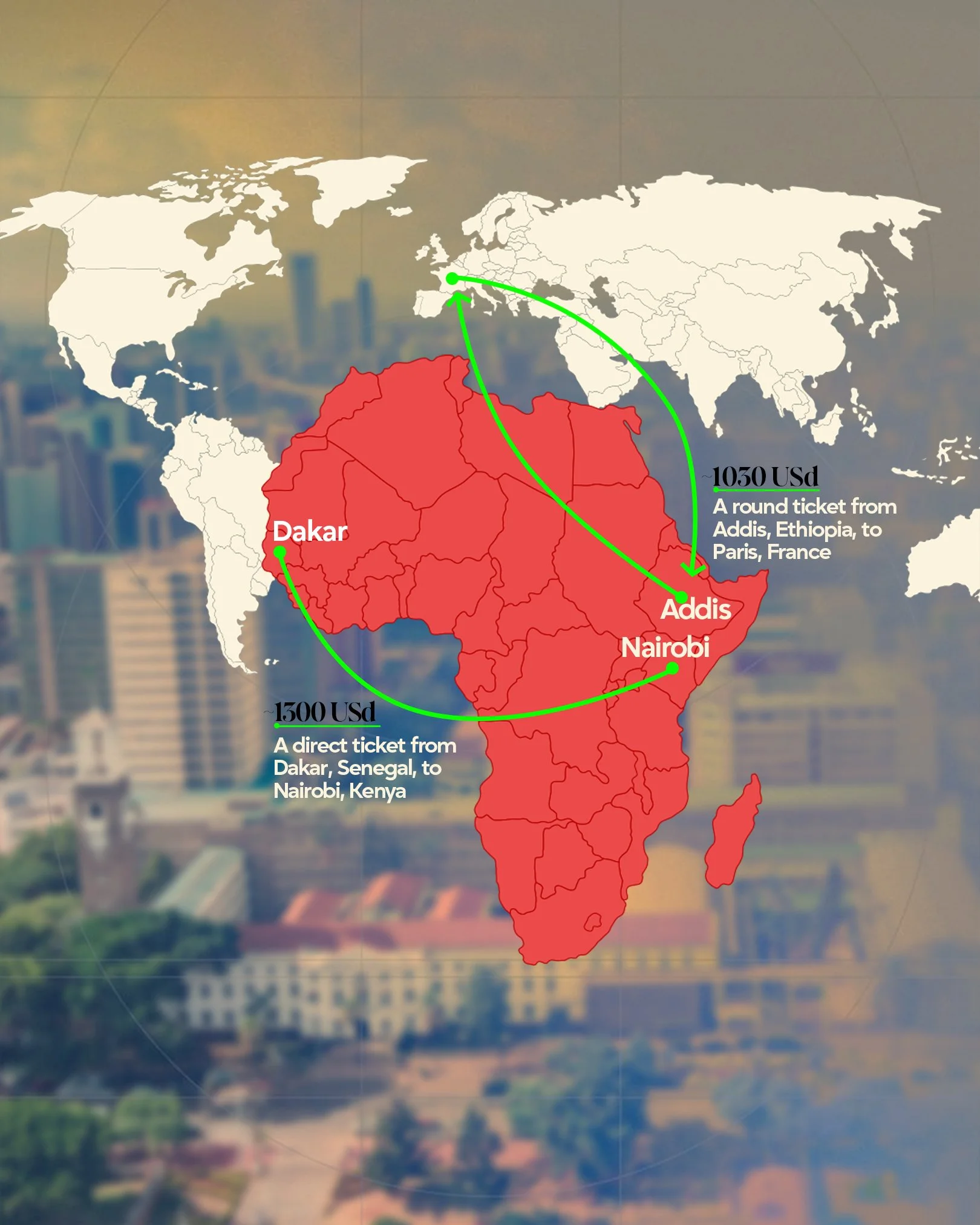 Flying within Africa can be surprisingly costly. A direct ticket from Dakar, Senegal, to Nairobi, Kenya can cost between 1 100 US dollars and 1 300 US dollars. By contrast, taking the same journey via a European hub like Paris, essentially leaving the continent and coming back, can cost slightly less, around US dollars 1 030 to US dollars 1 050, according to a recent International Civil Aviation Organization (ICAO) case study. In other words, it can be cheaper to go outside Africa and return than to fly directly within it.